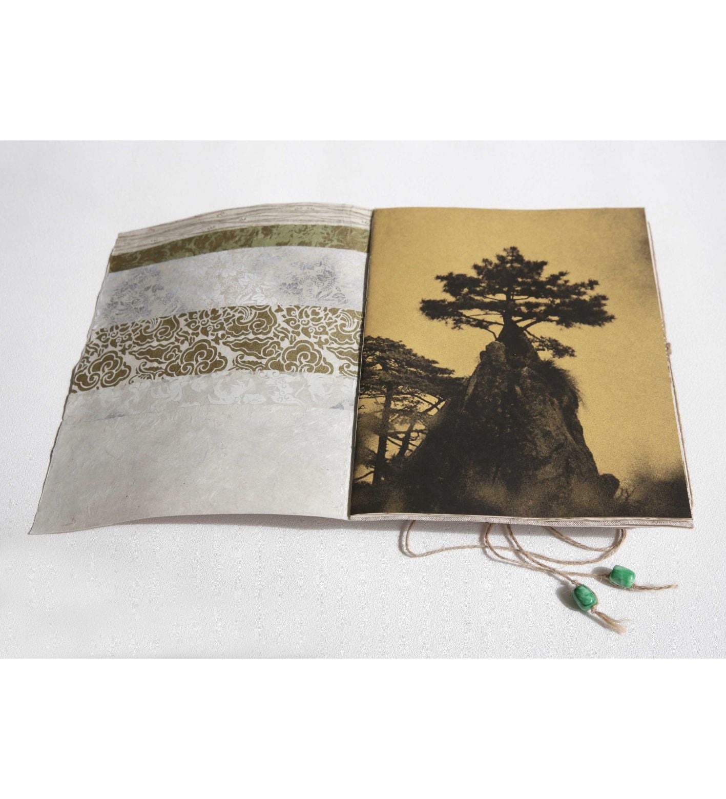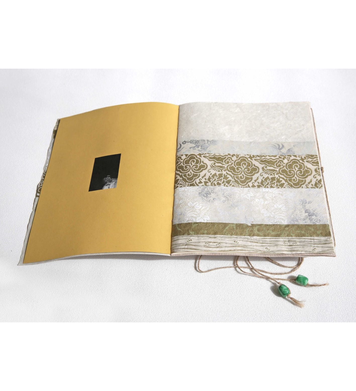 Format: Walnut wood box with filmed acrylic lid, Jade beads, Linen bookcloth, Nepali handmade collage paper stripes, Japanese kingin tissue paper with flecks of gold and silver