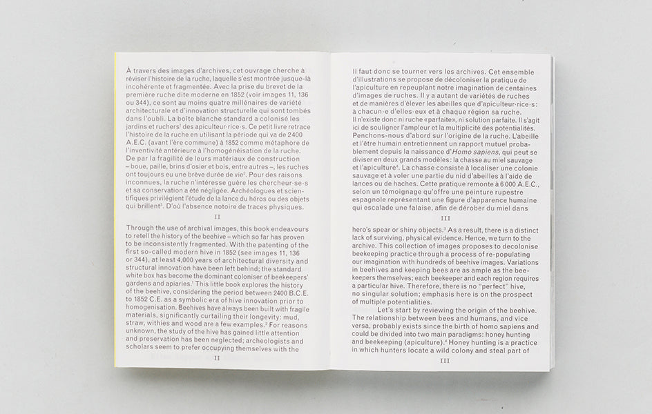 Since the birth of the modern beehive in 1852, structural innovation in hive construction has entered a dormant period. By favouring the standardised box hive, beekeeping turns its back on 4,400 years of architectural diversity. This little book focuses on that period of history prior to homogenisation, drawing from as far back as 2400 BCE. By rejecting a fixed narrative, linearity makes way for polymorphism, introducing graphic design, photography and writing to retell the story of beehives. The 375 images offer a glimpse into this proliferous history of architecture for non-humans.