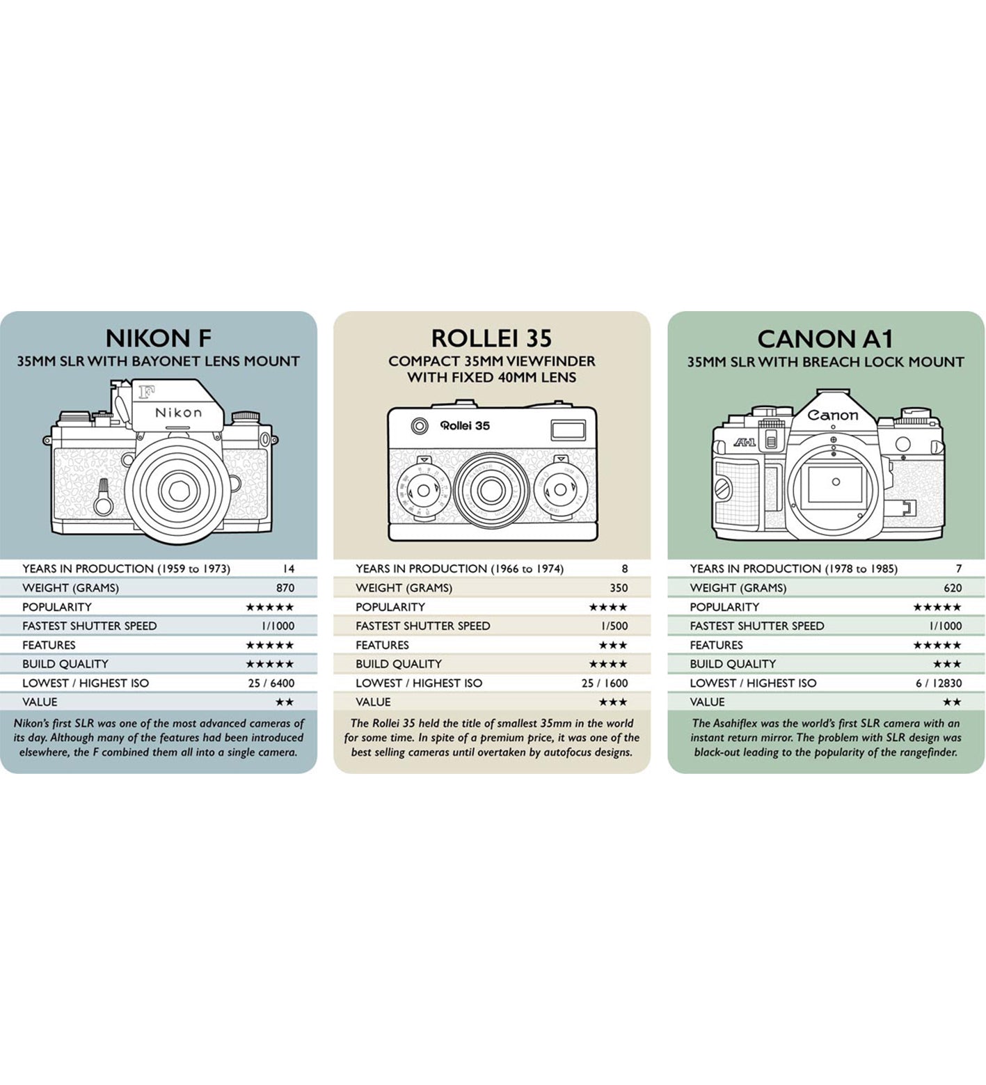 A Top Trumps style game featuring 36 of the best classic cameras of all time. Check the specs and test your knowledge in this beautifully illustrated trump card game. Enjoy discovering fascinating facts and exploring the history of some of the world's most loved classic cameras. Suitable for photographers of all ages and abilities.
