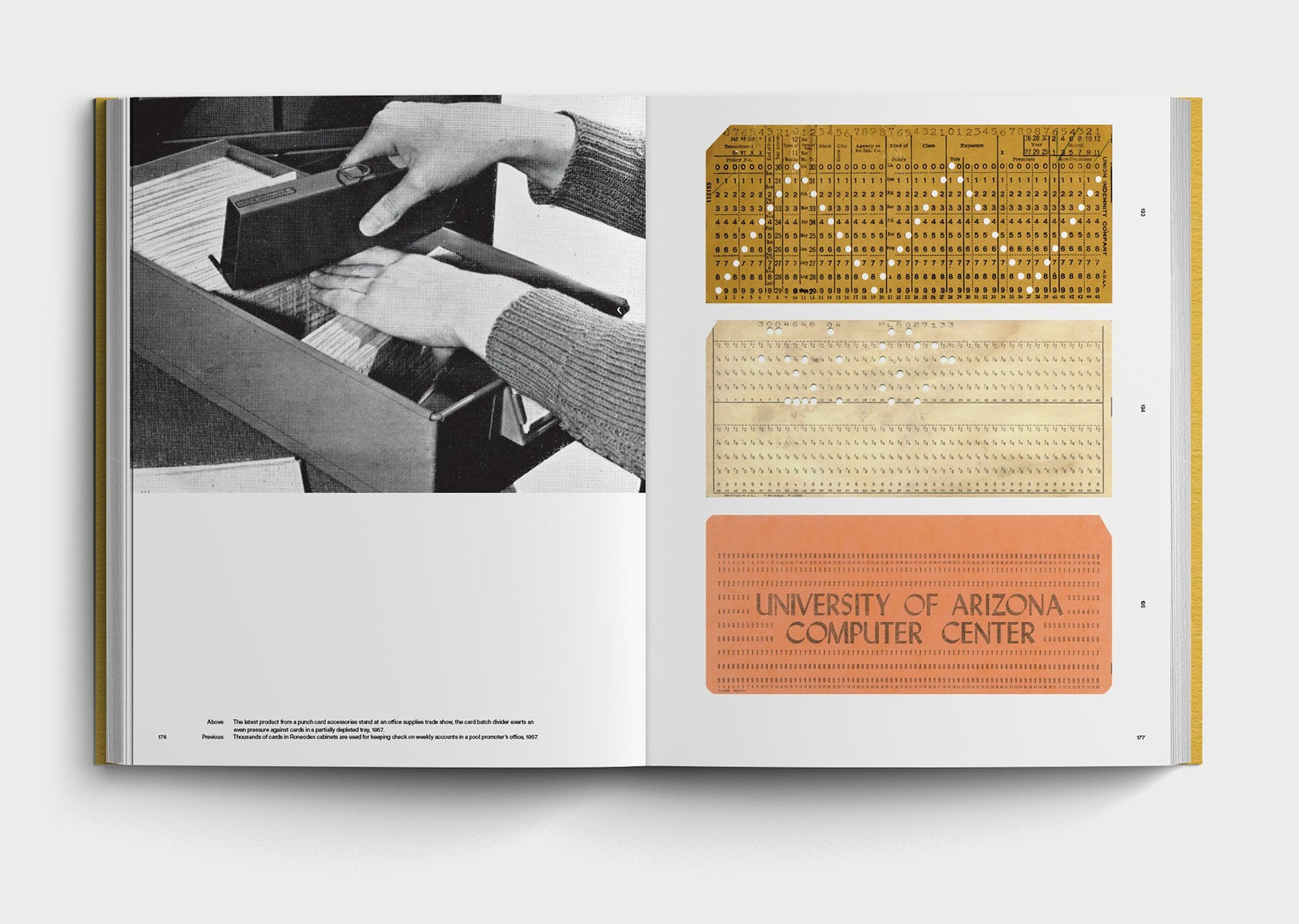 Print Punch returns to the heyday of the punch card—to a time when you could touch (and punch) data. The aesthetics of this early move towards automation represent a unique moment in our history, when we designed for machines instead of human beings. Rigorous constraints, inherent in punch card technology, unwittingly birthed a coherent design language: rhythm in grids, punched absences and presences, and the patterns in them dancing to their own machine logic. Now obsolete, punch cards were the primary method of data storage and processing from the 1890s until the late 1970s; spanning almost a century of ubiquitous utility, the artefacts of that era sit between these pages to be examined anew.