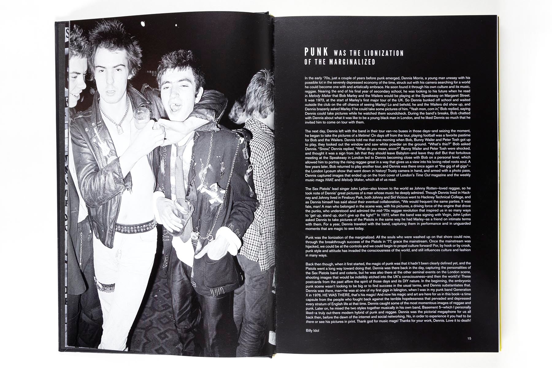 Dennis Morris’s photos of Bob Marley that caught the eye of the young Johnny Rotten. Rotten, a massive reggae fan, had long admired Dennis's work and requested that he take the first official shots of the Sex Pistols upon signing to Virgin Records. Still in his teens, Dennis was the same age as the Pistols and they soon learned to trust him completely, allowing him unrestricted access to their strange and chaotic existence. For a year, Dennis trailed the band, taking hundreds of undisputed classic shots of the band. The only photographer to put the Sex Pistols fully at ease in front of the lens, Dennis's work with the band established, not only their public image, but also Dennis's position as one of the most exciting and striking music photographers in the country.