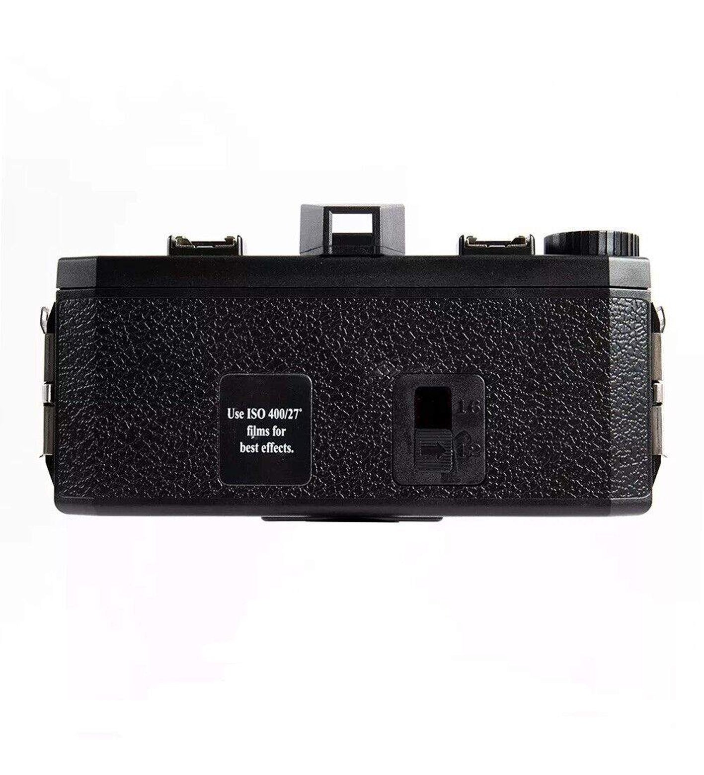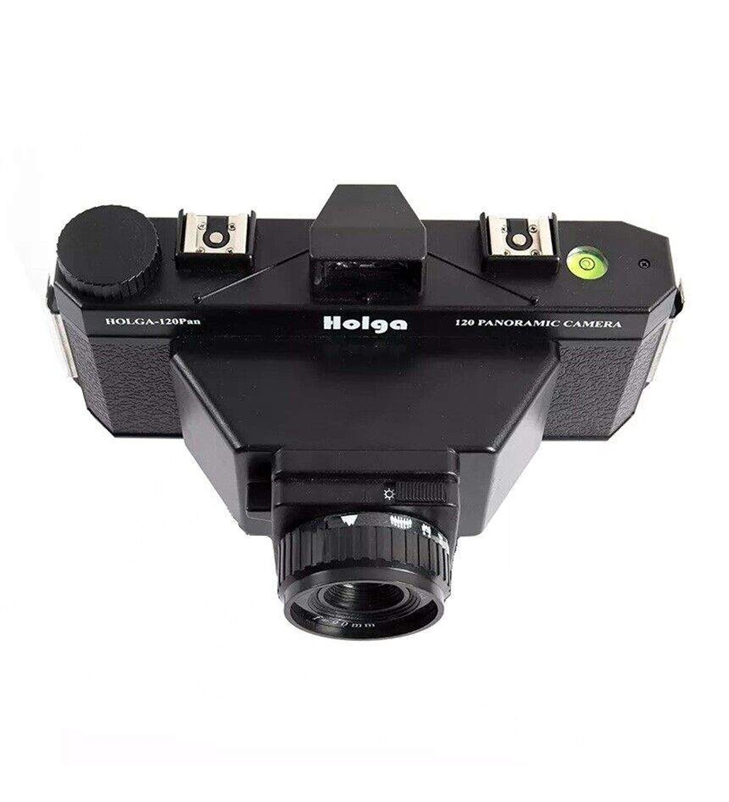 The Holga 120PAN is a panoramic camera enabling capture of images of almost 180 degrees from left to right. It's a fixed focus camera but with four focus distance settings. Shutter speed is 1/100 but with long exposure mode. To help capture panoramic pictures it has two hotshoes for external flash units and a built in spirit level to keep it straight.