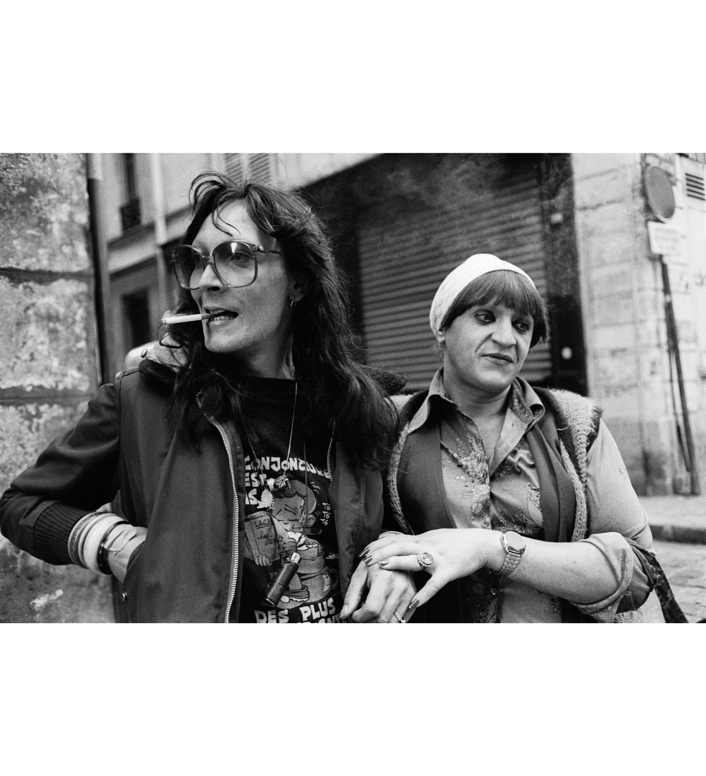 It is 1978 in Pigalle. Jane Evelyn Atwood, a young American, has been in Paris for a few years. She’s just completed her very first photo story about the prostitutes in town, in which she asserts from the beginning what will remain the fundamentals of her practice: long-term involvement, immersion, respect, empathy. And nightlife fascinates her. She continues. She wanders the small streets in back of the Boulevard de Clichy, the ones that climb to Abbesses, rue Houdon, André Antoine, Lepic, and the rue des Martyrs… Transsexuals dot the streets, soliciting men for 100 francs. The bars here are holes in the wall, not for outsiders. The tourists stay down on the Boulevard. There’s warmth, happiness as well as violence in the air.