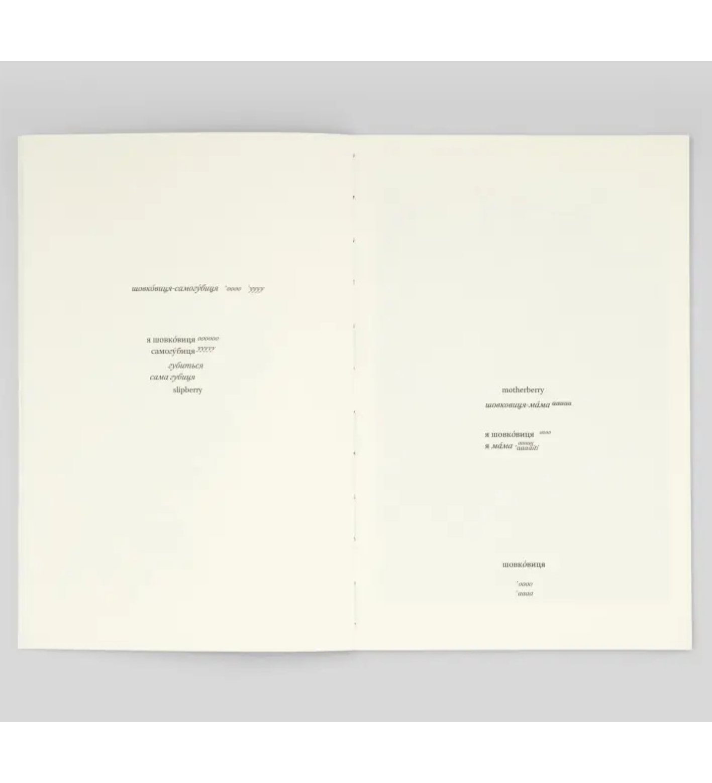 An art book by artist Katya Lesiv, grounded in sensory experience, myth, and female corporeality. The body appears as a moving vessel of memory, returning to the safety and pleasure of the childhood ritual of eating mulberries from the tree. Set against the backdrop of an unpredictable and fragile world, the artist’s work becomes a soft yet resilient gesture of presence, remembering, and returning.