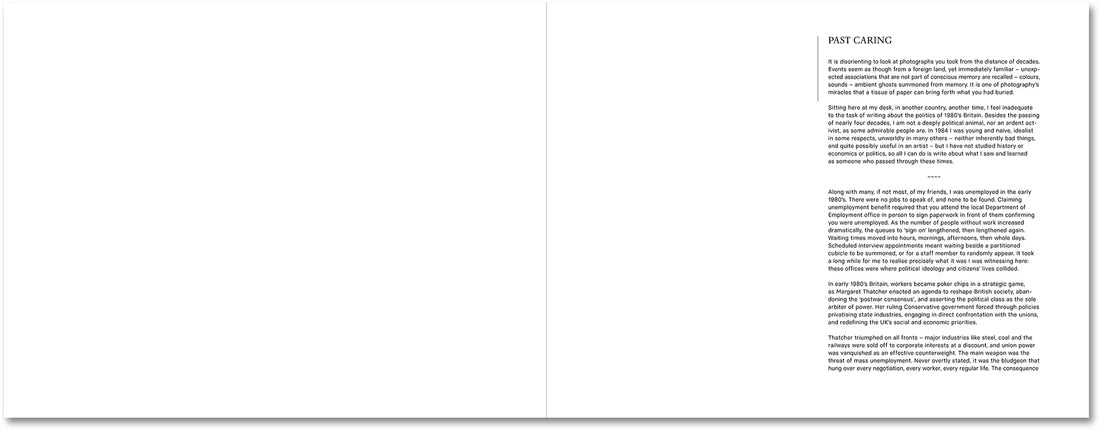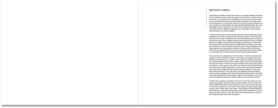 Originally self-published in 1985, Paul Graham’s renowned series, Beyond Caring, was made in the waiting rooms and corridors of the Social Security and Unemployment offices around the UK, documenting the long waits, queues and poor conditions of an overburdened system, to produce a powerful series of photographs conveying the hardship people experienced. Denied official permission to make the work, Graham’s photographs were taken discreetly, usually without looking through the camera, resulting in a spatial disorientation that emphasised the unmoored distress of vulnerable citizens. The work shocked many on its release – leading Magnum photographers were outraged by its use of colour in a classic documentary topic, while others celebrated how it straddled the world of activism and art (it was exhibited at both Trade Union conferences and the Museum of Modern Art, New York). Graham forged a fresh form of engaged photography, mixing elements of social documentary, ‘new colour’ and reportage to create a striking body of work that endures to this day. Many decades have passed since their making in 1984, but these images have grown not only in photographic importance, but also as a unique historic record of the mid-1980s unemployment crisis in the UK.
