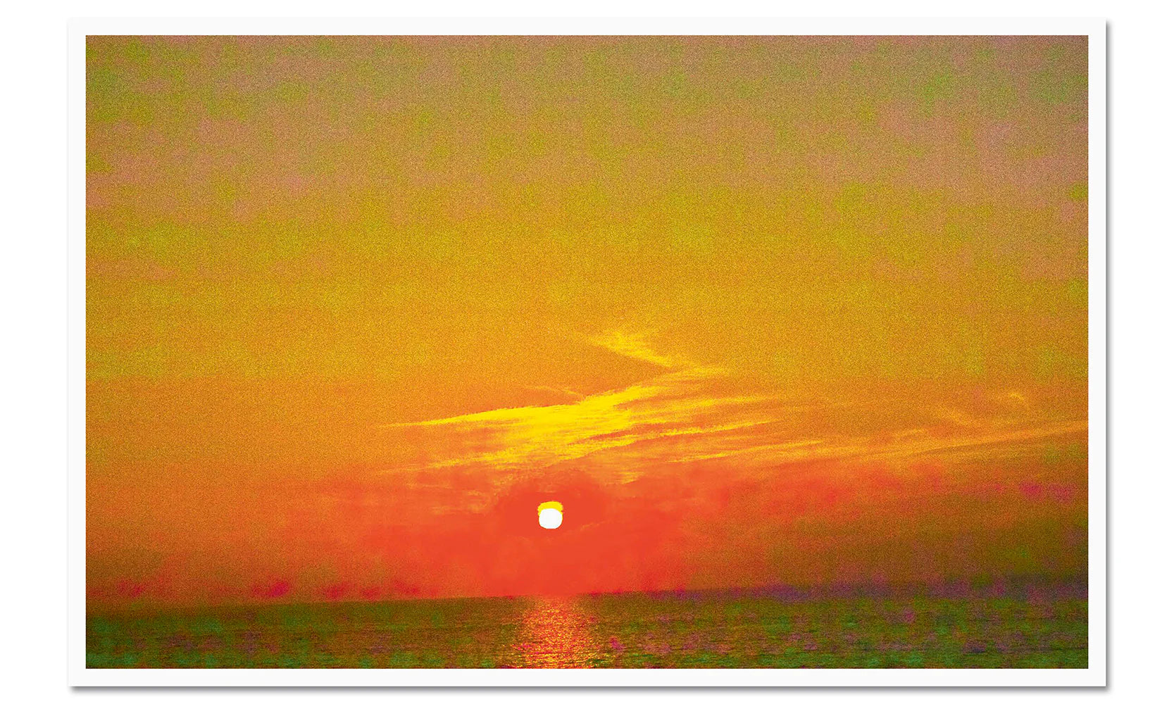 Graham takes these archetypal objects of natural beauty – and their observers – to form a layered examination of the ways we see and experience the beauty of the world. While the portraits of horizon-watchers are captured with golden-hour clarity, the interleaved images in each volume have been corrupted through the process of their creation. The blossom images in Verdigris are captured on a digital camera set to an ultra-resolution mode that uses multiple micro-shifted exposures. But disturbed by the gentle motion of a breeze, the camera struggles to assemble a coherent representation. Meanwhile the saturated sunsets of Ambergris result from a camera that is uniquely able to collect colour information at every pixel site, rather than approximate colour from nearby pixels. Pushed beyond its limits, the images become stained with artefacts of the overwhelming intensity of information.