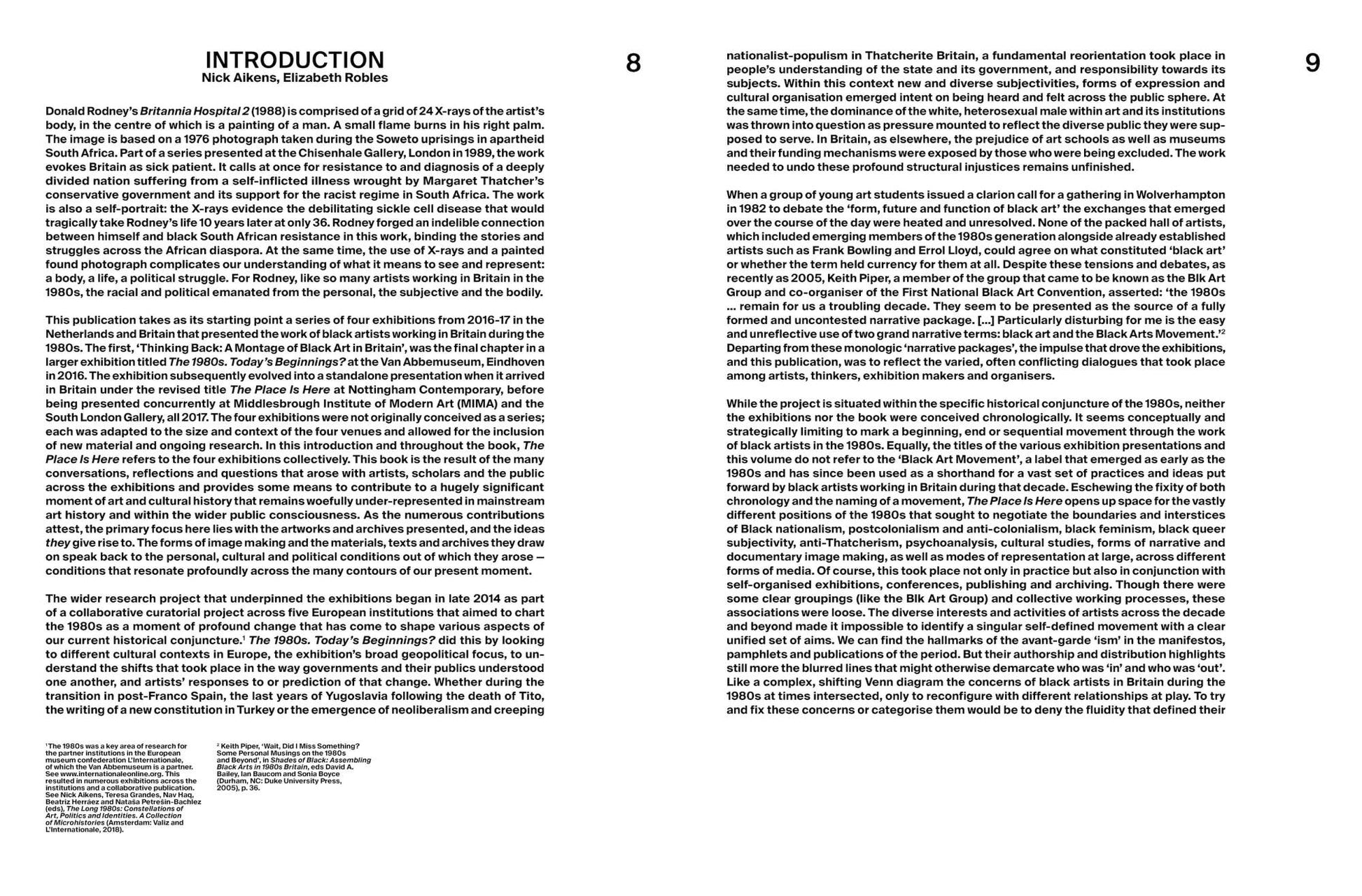 The publication developed from the exhibition and research project The Place Is Here (2016–19), which traced the urgent and wide-ranging conversations taking place between black artists, writers, and thinkers in Britain during the 1980s. Within the context of Thatcherism and a racist art establishment, a new generation of black artists and intellectuals produced some of the most compelling ideas and images in recent British cultural history. Across four exhibitions, The Place Is Here brought together over one hundred works by forty artists and collectives, spanning painting, sculpture, installation, photography, video, and expanded archival displays. Richly illustrated, the book includes thematic essays, close readings of works, and a series of panel discussions bringing together key scholarly, critical, and artistic voices foundational to art in Britain in the 1980s. The result is an intergenerational dialogue around pressing intellectual, political, and aesthetic debates, highlighting the significance of the work of these artists for the present.