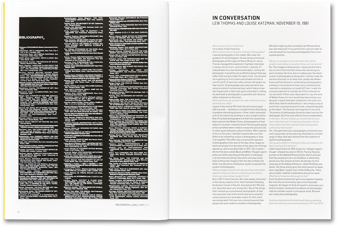 In the early 1970s, Lew Thomas set out to disrupt photography in San Francisco. Tired of the mystical thinking and emotionalism that had underscored Bay Area photography since the 1940s, Thomas pursued a photographic practice grounded in ideas gleaned from conceptual art and Structuralist philosophy. A cohort of other photographers, including Donna-Lee Phillips and Hal Fischer, embraced Thomas’ mission, joining him in what became known as the ‘Photography and Language’ movement, named after a book and group exhibition of the same title produced by Thomas in 1976.