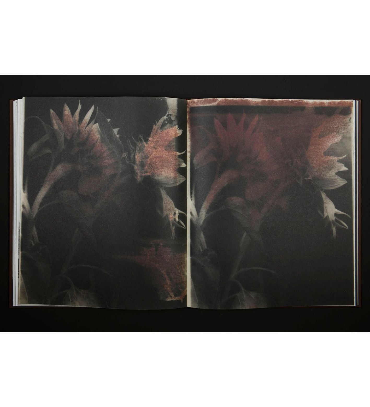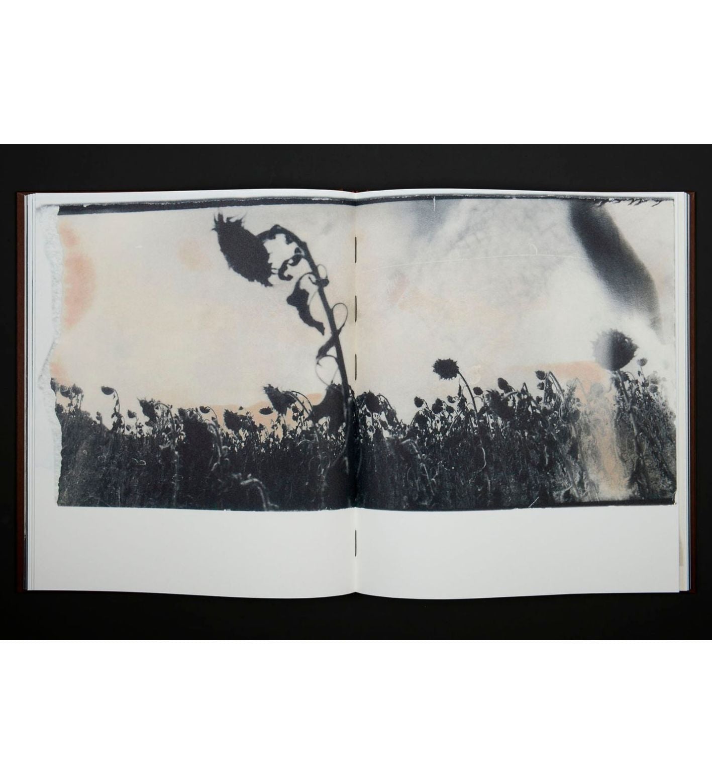 Bakin began to photograph landscapes scarred by war alongside damaged trees, rivers and fields of marching sunflowers. He would now develop the prints during air raids with a womb-like red light of the darkroom providing a place of safety and escape from reality. At one point he ran out of paper fixer and continued to use the same mixture until it was exhausted. The chemical imperfections also resulted in red and purple visual bruises on many of the images, an allegory for blood on the land.