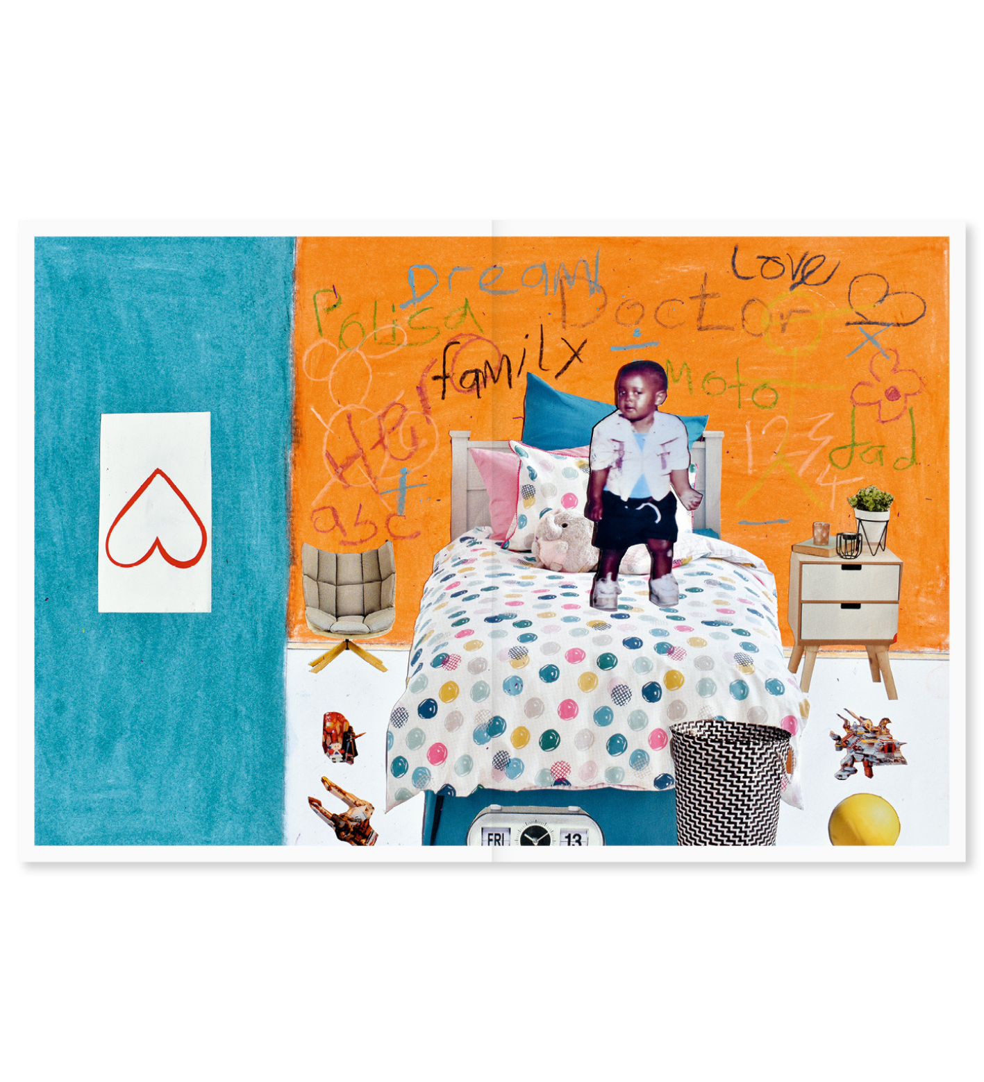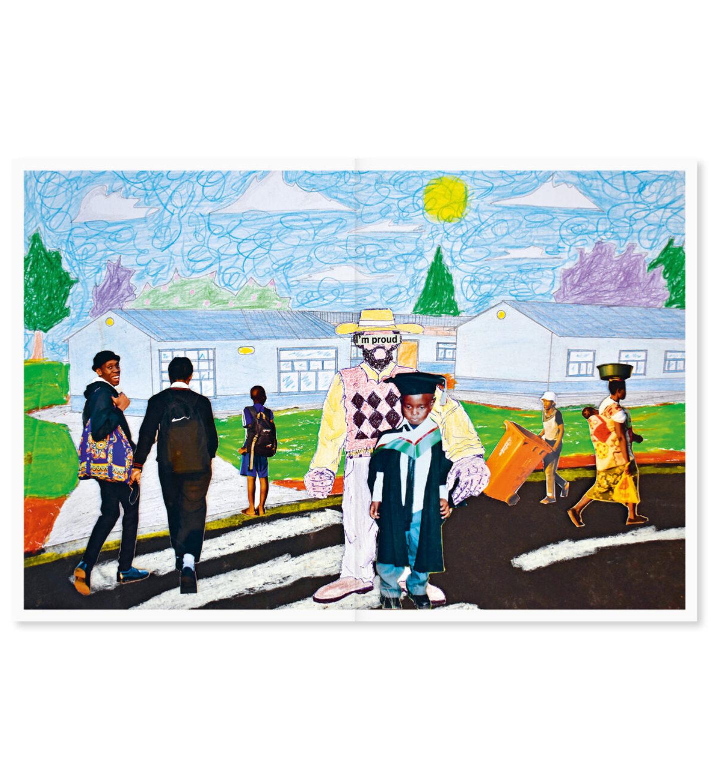 The Afrikaans word “pophuis” refers to a dollhouse game familiar to children. Vuyo Mabheka builds the Popihuise series based on this game, using cutouts from rare childhood photos of himself. He creates interiors and scenes where he appears, sometimes accompanied by imaginary friends — represented by people from his community whom he has secretly photographed, and sometimes in the presence of a fantasised and faceless father figure.