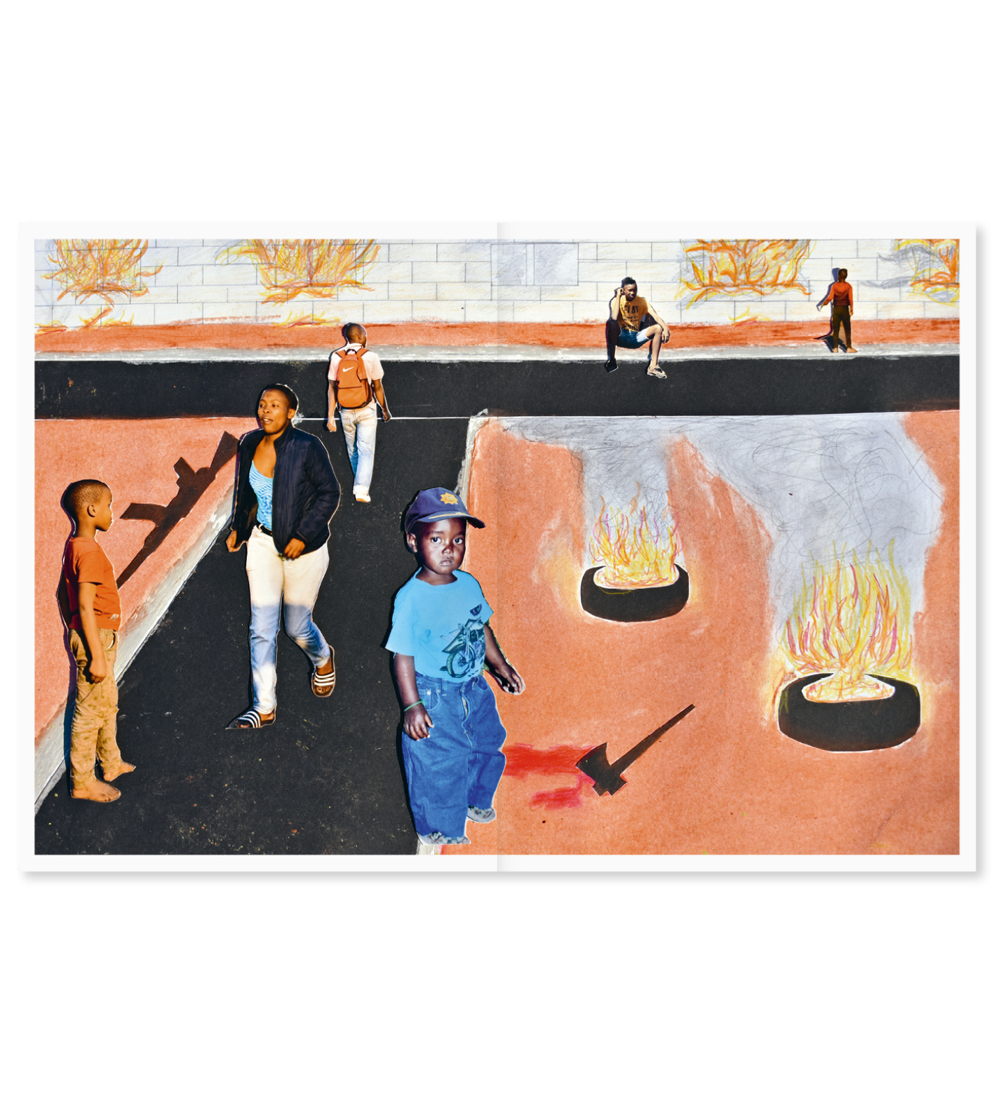 The series features a few core elements: drawings, collages, and photographs, coexist in a seemingly naïve and tender universe. Shiny cars, skyscrapers, burning tires, and new pavilions contrast with cultivated fields, colourful birds, graffiti, and blossoming trees.